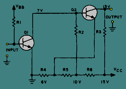 Notice that the output (collector) of Q1 is connected directly to the input (base) of Q2. The network of R4, R5, and R6 is a voltage divider used to provide the bias and operating voltages for Q1 and Q2. The entire circuit provides two stages of amplification.