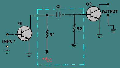 The rest of the coupling network (C1 and R1) functions just as their counterparts (C1 and R2) in the RC-coupling network. C1 couples the signal between stages while blocking the d.c. and R1 develops the input signal to the second stage (Q2).