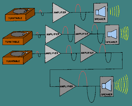 Figure 1-8 shows the effect of adding stages of amplification. As stages of amplification are added, the signal increases and the final output (from the speaker) is increased.
